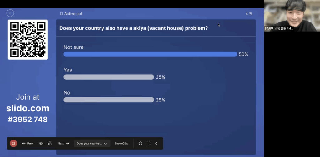 To deepen the conversation around global vacant home issues, we asked participants several questions throughout the session and invited them to share their insights. One key question explored whether their home countries also struggled with a vacant house problem. The responses revealed an interesting divide: while 25% of participants said “Yes,” and another 25% said “No,” the largest group—50%—answered “Not sure.”