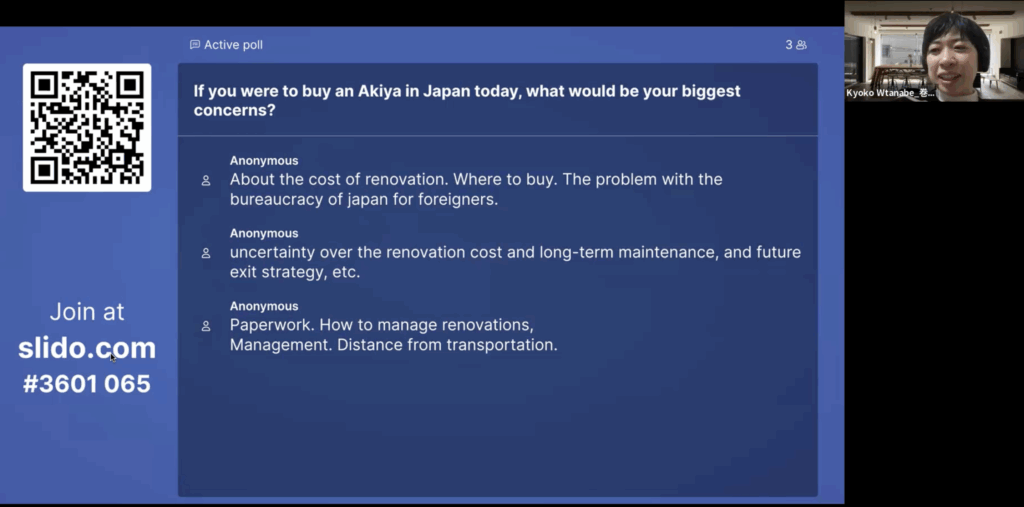 Another key question explored what concerns people might have when considering the purchase of an akiya in Japan. Participants pointed to several common barriers: uncertainty around renovation costs, ongoing maintenance, required paperwork, and the bureaucratic challenges that many foreign buyers often face.
